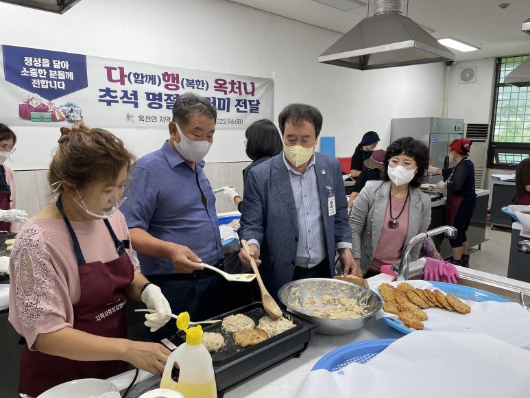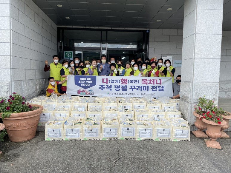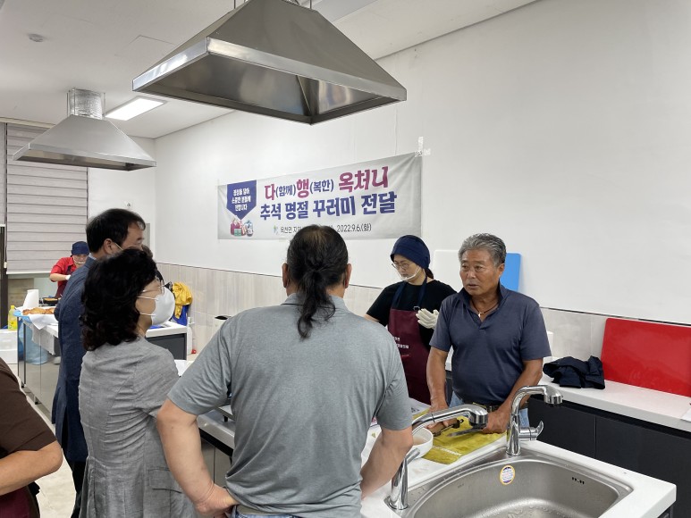 1) 일시 : 2022. 9. 5.(월) ~ 9.6.(화) 2) 사 업 명 : 다(함께)행(복한)옥처니 추석 명절 꾸러미 전달 3) 지원대상 : 옥천면 관내 저소득 취약계층 70가구 4) 지원내용: 추석 명절을 맞이하여 추석음식 및 선물꾸러미를 전달하며 취약계층 안부확인