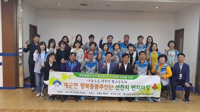 ■ 2017년 개군면 행복돌봄추진단 선진지 벤치마킹 추진 일정 1) 일 정 : 2017년 06월 02일 2) 장 소 : 강원도 동해시 3) 참석대상 : 개군면 행복돌봄추진단(지역사회보장협의체) 35명 4) 내 용 : 지역사회보장협의체 운영 활성화 및 지역복지문제 해결을 위한 선진지 벤치마킹 ►결과 사진자료 ![]() ![]() |